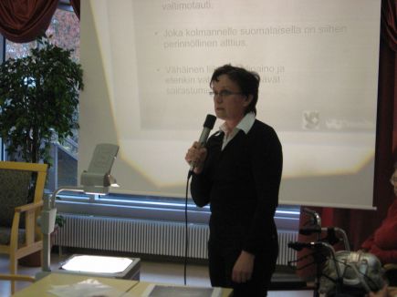 ![]() Hyvää elämääKivirannassa ti 24.11.klo 19.00 tietoa ja keskustelua diabeteksestä, tervetuloa. Suomessa on yli 240 000 II-tyypin diabeetikkoa (v.2008) ja vielä enemmän diagnosoimattomia eli puhutaan yli puolesta miljoonasta 2.-tyypin diabeetikosta. Luvut kasvavat huolestuttavaa vauhtia koko maailmassa. Oireet alkavat yleensä vaivihkaa ja ihminen tottuu niihin pikkuhiljaa eikä huomaa muutoksia. Varhainen toteaminen olisi kuitenkin tärkeää, jotta lisäsairauksien kehittyminen voitaisiin pysäyttää tehokkaalla elämäntapaan liittyvillä toiminnoilla. Ja elämänlaatukin paranee! Kohonnut verensokeri alkaa vaurioittaa kudoksia taudin varhaisessa vaiheessa: silmänpohjat, valtimon seinämät, munuaiset, hermot. Sydänkohtauksien suuri riskiryhmä on juuri diabeetikot. Ennaltaehkäisy hoidossa on oleellisen tärkeää. Ikäihmisten virkistyspäivänä Uusisalon Anne kertoi diabeteksesta (kuva). Nyt jatkamme suuremmalla joukolla eli tämä tiistain tilaisuus on tarkoitettu kaikelle kansalle. Seutukunnan diabetesyhdistys pitää samalla syyskokouksen täällä Kyyjärvellä ja järjestää siis diabetesvalistusta-näyttelyn-keskustelua-yhdessäoloa. PS. myös kahvitus ja arvontaa. TERVETULOA! |