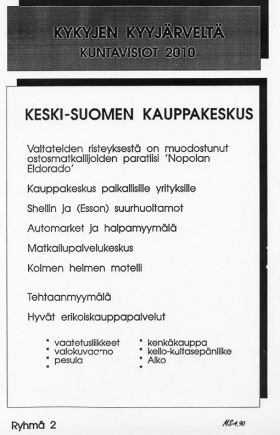![]() Paletti kehittyy"Oli se Markku visionääri" Kyyjärven kunnan ja Keskimaa osuuskunnan omistama Kyyjärven Paletti oy on kymmenvuotisen historiansa aikana vakiinnuttanut paikkansa suomalsten kauppapalvelunähtävyyksien keskuudessa. Palettiin tullaan paikallisesti hoitamaan päivittäisasiointia, kauempaa tekemään erikoisliikeostoksia ja ohikulkumatkalla virkistäytymään. Tulevaisuudessa Paletti pystyy palvelemaan asiakaskuntaansa toivottavasti siten kuin kunnanjohtaja Markku Suuniittu jo vuonna 1990 hahmotteli visiossaan Kyyjärven kunnasta vuonna 2010. Kyyjärven kunnanhallitus odottaa parhaillaan visiota Paletin tulevaisuudesta. Loppuvuoden aikana Nopolan Kylätalkkarit osuuskunnan kehittämisosasto Janne Pulkkisen johdolla valmistea esityksen vuodenvaihteeseen mennessä, jolloin alkaa varsinainen työ. Jo nyt on kuitenkin selvää, että kiinnostusta Palettiin on esitetty niin toisen päivittäistavarakauppaketjun kuin monien erikoisliikkeidenkin osalta. Myös jäämonitoimitilan, elokuvateatterin ja jopa kunnanviraston sijoittamisesta kauppakeskukseen on puhuttu. Kaikki esitykset eivät välttämättä tule sisältymään Pulkkisen ja hänen tiiminsä lopulliseen esitykseen, mutta tässä vaiheessa kannustan kaikkia ideoimaan jopa villistikin sitä mitä Paletti voisi tulevaisuudessa olla. Näin varmasti parhaiten kunnioittaisimme visionääri Markunkin muistoa. Kyyjärven Paletti ei välttämättä tulevaisuudessa ole pelkkä kauppakeskus, vaan se voi olla jotain paljon enemmän. Paletti nimensä mukaan on kokoelma erilaisista osatekijöistä, jolloin kauppakeskuksen rinnalla Paletin palasia voivat olla vaikkapa Leirintäalue, Monitoimitalon MiniSpa sekä sellaiset kunnalliset nähtävyydet kuin Mikojanin linna tai vaikkapa hienon perinteen sisäänsä kätkevä Honkalehdon Kievari. Kyyjärven Paletti on siis jotain, joka tulevaisuudessakin on, vaikka varsinaista kuntaa ei joskus olisikaan. Tulevaisuutemme rakentuu nimenomaan laajastiymmärretyn Paletin ympärille, unohtamatta kuitenkaan johtavia yrityksiämme, kuten vaikkapa Betset oy:tä. Ideoinnin rinnalla vetoan edelleen kaikkiin kuntalaisiin sen osalta, että jaksaisitte nyt tehdä muun muassa kodinremontteja. Tällä hetkellä työvoima on halpaa ja sitä on saatavilla. Lisäksi valtio tukee remontointia merkittävillä verohelpotuksilla kotitalousvähennyksen muodossa. Kun ajoitus vielä osuu kohdille sen osalta, että osa remontista toteutetaan loppuvuoden aikana ja osa alkuvuonna, on hyöty kaksinkertainen. Lisäksi investoimalla itseensä ja asumiseensa, tulee kuntalainen myös auttaneeksi muitakin. Ostamalla toisen työtä,antaa hän tällekin mahdollisuuden ostaa jotain muuta, jonkun toisen lähimmäisen työtä. Siten syntyy hyvinvoinnin kasvun kierre, joka lopulta auttaa meitä kaikkia ja mahdollistaa nykyisten korkeatasoisten palvelujen säilyttämisen. Nyt siis kaikki joukolla suunnittelemaan remontteja vaikkapa Hannu Aumaselta lisätietoja kysyen. Pankinjohtajankin mukaan ovet ovat auki mahdollisille lainaneuvotteluille. Vaikka kunta yrittää kaikin keinoin ylläpitää korkeaa työllisyyttä, ovat meidän panoksemme vain pisara siinä meressä, jonka te kuntalaiset, voitte toistenne hyväksi tehdä! Olkaamme siis solidaarisia toisiamme kohtaan! |