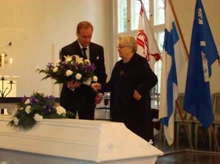 ![]() Esa Oikari saateltiin haudan lepoonKyyjärven seurakunnan jäsen Esa Oikari siunattiin Karstulan kirkossa perjantaina 20.11.2009. Siunauksen jälkeen hänet saateltiin sukuhautaan Karstulan kirkkomaahan. Muistotilaisuus oli kotona Kyyjärven Oikarilla. Esa Olavi Oikari syntyi Oikarin kylällä Lauri ja Marja Oikarin perheen nuorimpana lapsena 15.6.1923. Äiti kuoli hänen ollessaan vain puolen vuoden ikäinen. Sijaisäitinä toimi Rauha täti ja Alma mummo. Hän varttui maatalouskodissaan ja kävi kansakoulun. Töihin opittiin heti lapsesta saakka. Sisarukset avioituivat ja muuttivat pois kotoa, Tapio veli kuoli nuorena, Esan oli jatkettava Lauri-isän kanssa talonpitoa. Isänmaan ääni kutsui nuoren miehen sotaan. Hän oli Talvisodan aikana ilmapuolustuksessa, Jatkosodassa hän taisteli tarkka-ampujana Syvärillä, Karjalan kannaksella mm. Tali-Ihantalassa. Lapin sodassa hän osallistui Tornion valtaukseen. Esa haavoittui kaksi kertaa: Syvärillä 1942 ja Torniossa 1944. Sodasta palattuaan hän tutustui Irene Kirvesmäkeen, jonka kanssa kihlautui v.1945 ja häitä vietettiin Oikarin kodissa v.1946. Avioliitosta syntyivät lapset: Eija, Lassi, Marjatta, Irma, Marja-Terttu, Kirsi ja Minna. Irene ja Esa asuivat Esan kotitaloa "Esalaa" toimellisesti. Pellot raivattiin ja hankittiin lisää tiluksia. Traktori hankittiin v.1951, jolla Esa teki rahtitöitä kyläläisille niin paljon kuin ehti. Lisäksi hän ajoi puutavaraa Oikarin sahalta vapaa-aikoina. 1950-luvun lopulla rakennettiin uusi navetta, johon Esa itse löi tiilet. Vanha sukutalo kunnostettiin ja ostettiin puimuri, jolla Esa sitten pui myös kyläläisten peltoja. Lehmät vaihtuivat sikoihin 1960-luvun puolessa välissä. Sikataloutta on sitten Irma tytär yhdessä Tommi puolison kanssa jatkaneet kotitilalla vuodesta 1983 alkaen. Esan harrastuksiin on kuulunut nuoruudesta saakka metsästys, ammunta ja urheilu. Hän kuului Suojeluskunnan poikaosastoon ja toimi luottamustehtävissä mm. pitkään Kyyjärven Osuuspankin hallinnossa ja kunnan vaalilautakunnassa. Esalle isänmaa oli perusarvoja. Hän oli mukana innokkaasti sotaveteraani ja -invalidi työssä. Koti oli rakas paikka, puoliso ja lapset. "Meillä on hyvä olla", toisteli Esa monesti sairauden aikana Irene puolisolle. Uskosta tuli Esalle sydämen asia. Hän monet kerrat järjesteli veteraani ja invalidi kirkkopyhiä ja kävi Irenen kanssa kirkossa. Esaa jäivät kaipaamaan puoliso, lapset ja lastenlapset perheineen, sukulaiset ja ystävät. Siunauksen Karstulan kirkossa toimitti khra Olavi Vallivaara, kanttorina oli Jouni Mäkinen, lastenlapset lauloivat sekä Kyyjärven kirkkokuoron miehet lauloivat "Veteraanin iltahuudon". Hautauksen jälkeen kotona Oikarilla puhuivat: Lassi Oikari, Tapio Mäntynen ja Olavi Vallivaara.Adressit lukivat: Tommi Bergman ja Liisa Oikari sekä yhdessä laulettiin Esalle läheisiä virsiä. |