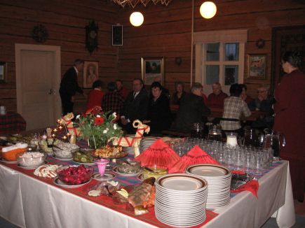 ![]() Saarijärven-Karstulan seudun hengitysyhdistysPikkujouluruokailu Ränssin Kievarissa sunnuntaina 29.11.2009. Säätila ei niin järin jouluinen ollut sunnuntaina, puolenpäivän maissa, kun matkaan lähdimme. Tunnelma muuttui, kun 43 henkilön seurue saatiin mukaan, Kyyjärveltä, Karstulasta, Saarijärveltä, Kivijärveltä ja Kannonkoskelta. Puheensorina linja-autossa oli hauskaa kuunnella. Tuttavat siellä vaihtoi kuulumisiaan. Olemme jo vanhoja tuttuja myös Ränssin Kievarin yrittäjille ja henkilökunnalle. Kolme teatterimatkaa ja nyt tämä pikkujouluruokailu reissu on sinne tehty. Nimipäiväonnittelulauluja lauloimme Aimolle menomatkalla ja Antille tulomatkalla, vieläpä kaksi säkeistöä tutusta "biisistä" PALJON ONNEA VAAN. Ruoka oli tosi maittavaa ja upea kattaus noutopöydässä herätti kaikkien ruokahalun. Varmasti monelle tuli oman äidin tekemät jouluruuat mieleen. Lanttulaatikko, imelletty perunalaatikko, Karjalanpaisti ja kinkku ja ne monet muut tutut kala ja vihennesruuat ja salaatit jotka olivat tarjolla. Herkkuja oli siellä monenlaisia. Ohjelmaakin oli juuri sopivasti. Pannulapun kutojat teki protestin, vääränlainen lanka ja hämärä paikka, tosin takkatuli lämmitti osallistujia mukavasti. Tästä otamme opiksemme. Siis, nyt yhdistyksemme miespuoliset jäsenet, kaikki treenaamaan pannulapun kutomista. Sitäkin taitoa voi joskus pikkujoulureissulla tarvita. Pekka ja Pentti laulatti meitä. Monta tuttua joululaulua lauloimme yhdessä. Niin, ja se pikkujuttu. Huonosta kelistä riippumatta, itse Joulu-pukki saapui paikalle. Nyt en muistanut kysyä, että millä kulkupelillä pukki oli matkaan lähtenyt. Olimme niin yllättyneitä pukin tulemisesta, näet, aikaisempina vuosina on pukkipoloisella ollut paljon vastoinkäymisiä. Joskus on reki rikki, joskus porolla jalkavaivoja ja muistaakseni, kerran meni sukset ristiin Muorin kanssa, kun pukki ei ole koskaan jouluna kotona. No, vähemmästäkin sitä hermostutaan. Kotimatkalla yhdistyksemme sihteeri Raija Hakkarainen luki syyskokouksemme päätöksiä. Kokouksen päätöksiä: