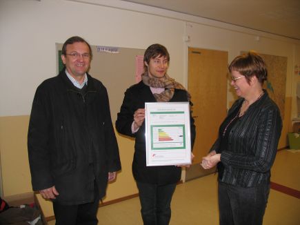 ![]() Energiatodistus Nopolan koululleKeski-Suomen Energiatoimisto laati Kyyjärven Nopolan koululle energiatodistuksen joka on yleisön nähtävillä. Keski-Suomen energiatoimiston edustajat luovuttivat keskiviikkona 9.12.2009 laatimansa energiatodistuksen Kyyjärven kunnan Nopolan koululle (ala-aste). Kuvassa vasemmalta lukien toimitusjohtaja Esko Ojaniemi, projektipäällikkö Lauri Penttinen. Todistusta vastaanottamassa koulun puolesta rehtorin sijaisena opettaja Kaisa Tamminen.(katso linkki energiatodistus) Keski-Suomen energiatoimisto perustettiin vuonna 1998 jatkamaan Keski-Suomen liiton energiatyöryhmän työtä. Toimiston alkurahoitus saatiin EU:n SAVE -ohjelmasta. Alkuvaiheessa yhteistyökumppaneina olivat mm. Keski-Suomen liitto, Jyväskylän Teknologiakeskus Oy, Keski-Suomen Valo Oy, Jyväskylän Energia sekä Keski-Suomen kuntia ja yrityksiä. Keski-Suomen Energiatoimisto kuuluu Suomen energiatoimistojen verkostoon, jonka kansallisena energiatoimistona toimii Motiva Oy. Energiatoimistoja on eri puolilla Eurooppaa noin 380. Suomessa energiatoimistoja on kahdeksan. Energiatoimistot edistävät energiatehokkuutta ja uusiutuvien energialähteiden käyttöä. Ne palvelevat monipuolisesti ja puolueettomasti alueen yrityksiä ja yhteisöjä sekä toteuttavat yhteistyössä erilaisia energiahankkeita. Vuoden 2008 alusta lähtien Keski-Suomen Energiatoimistoa on hallinnoinut bioenergian verkostoyritys Benet Oy. Keski-Suomen Energiatoimisto palvelee kaikissa energian tuotantoon ja käyttöön liittyvissä kysymyksissä. `Lehdistötiedote, Keski-Suomen Energiatoimisto` Keski-Suomen Energiatoimisto laatii Keski-Suomen kuntien julkisiin rakennuksiin energiatodistuksia jotka asetetaan kuntalaisten nähtäville. Energiatodistus kuvaa rakennuksen energiatehokkuutta antamalla sille energialuokan A - G niin, että A on paras ja G huonoin luokka. Yleensä tämän hetken rakentamistavan mukaiset rakennukset saavat luokkaan D tai E. Keskisuomalaiset kunnat ovat tässä asiassa edellä aikaansa, sillä energiatodistukset julkisissa tiloissa eivät Suomessa vielä ole pakollisia. Energiatodistusten julkinen esillepano rakennuksissa joissa asioi kuntalaisia, on monissa EU-maissa pakolliseksi säädetty käytäntö jolla lisätään avoimuutta kunnan hallinnossa. Kuntalaiset voivat asioidessaan vilkaista miten säästäväisesti tai tuhlailevasti energiaa käytetään heidän rakennuksissaan. Samalla kuntien päättäjät saavat tietoa rakennustensa energiankulutuksesta ja säästötoimien merkityksestä. Kyyjärvelle energiatodistus laadittiin Nopolan koululle. Koulun energiatehokkuusluvuksi saatiin 250 kWh/brm2, eli rakennus kuluttaa lämmitysenergiaa ja kiinteistösähköä vuodessa yhteensä noin 250 kilowattituntia per rakennuksen bruttoneliömetri. Energiatehokkuuslukua vastaavaksi energialuokaksi tuli E. Tämän perusteella voidaan sanoa, että rakennuksen energiatehokkuus on sen ikään ja käyttötarkoitukseen nähden keskimääräistä tasoa, mutta säästömahdollisuuksia voi kuitenkin yhä olla. Rakennus lämpiää ympäristöystävällisellä kaukolämmöllä, joskin myös hieman sähköä käytetään ilmanvaihto- ja lattialämmitykseen. Keski-Suomen Energiatoimiston sivut www.kesto.fi Keski-Suomen Energiapäivä järjestetään 28.1.2010, Jyväskylän Mattilanniemessä (Agora-rakennus). Lisää tietoa Energiatoimiston nettisivuilta. Tervetuloa! Hyvää tietoa energiansäästöstä löytyy myös mm. osoitteista Lisätietoja antaa Projektipäällikkö Lauri Penttinen, Keski-Suomen Energiatoimisto 044-0277 666 |