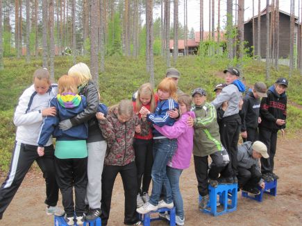 Aamulla ope tuli herättämään 7.45. Aamiainen oli valmista, sen kun vain nostaisi lautaselle. Ruokana oli muroja, myslejä, jugurttia, leipää ja karjalanpiirakoita. Ruoka oli tosi hyvää. Sen jälkeen lähdimme tekemään luutöitä. Sai valita, tekeekö hirven sarvista vai naudan luusta. Jokainen sai valita itse, minkälaisen korun tekee luusta. Luu oli todella kovaa ja sitä oli aika hankala työstää. Saimme kuitenkin hyvät ohjeet. Luutöiden teko oli kivaa. Kun oli valittu luupala, mentiin ruuvipenkin luo ja sahattiin se haluttuun muotoon. Sitten erilaisilla viiloilla viilattiin työtä, kunnes se sai hienomman ja halutun muodon. Sitten työtä alettiin hioa sileäksi eri tuntuisilla hiomapapereilla. Ensin 80, sitten 100 ja sitten 240. Lopuksi työt kiillotettiin lampaanvillalla. Kun työ oli sopivan muotoinen ja siloinen, siihen porattiin reikä haluttuun kohtaan. Sitten vain naru paikalleen ja koru oli valmis. Kaikki saivat aikaan todella hienoja koruja. Lounaalla oli ruokana perunamuussia ja kaalikääryleitä. Jälkkäriksi oli hedelmärahkaa. Lounaan jälkeen lähdimme ongelmaradalle. Rataan kuului monta vaihetta, mutta jokaisessa oli tärkeintä yhteistyö. Ilman sitä homma ei onnistunut. Ensin piti koko luokan päästä käsi kädessä maahan puoliksi upotettujen renkaiden yli. Jos joku tippui maahan, aloitimme alusta. Sitten koko luokka meni lankulle. Alla oli meri täynnä piraijoita. Meidän piti laittaa itsemme aakkosjärjestykseen tippumatta lankulta. Seuraavaksi piti viiden korin avulla päästä suon yli liikuttamalla koreja eteenpäin. Koko luokan piti olla yhtä aikaa korien päällä. Sitten kokosimme viidestä palasesta ison ristin. Se oli yllättävän hankalaa. Meidän piti myös saada laskettua pitkä keppi yhteistyössä etusormian varassa lattiaan asti. Sokkeloisessa putkessa piti saada pallo kulkemaan reitti läpi. Sitten suuntasimme jousiammuntaan. Käytettävissä oli kolme jousta ja maalitaulua. Ampuminen oli aika helppoa, jos tajusi tyylin. Se oli hauskaa. Ammuimme jousilla noin kaksi tuntia. Lopuksi otimme kisan, kuka saa eniten pisteitä viidellä nuolella. Paras tulos oli Hannulla 35 pistettä, mutta Tilla vei oppilaiden voiton pistein 30 tasan. Sää oli tänään vaihtelevaa. Sadekuuroja oli muutama, mutta lopuksi aurinkokin pilkisti taivaalta. |