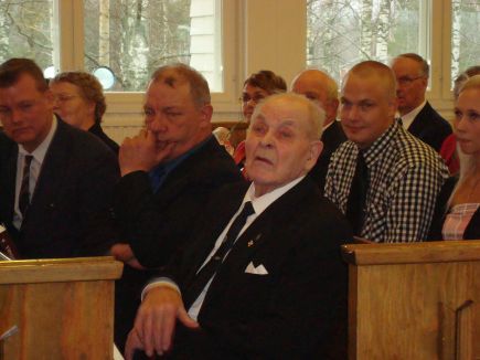 ![]() Einoa juhlittiin kirkossaSunnuntaina 31.10.2010 oli Nurmijoen kylän kirkkopyhä ja samalla Eino Takasen 90-vuotisjuhla. Messussa seurakunnan työntekijöitä avustivat Nurmijoen kyläläiset. Suvi Kantonen lausui tervehdyssanat, Sirpa Aksela ja Janne Pillikko lukivat tekstit ja Kirkkokuoro lauloi. Jp:n jälkeen Heikki Takanen toivotti kirkkoväen tervetulleeksi juhlakeitolle. Eino Takasen pojanpojat Olli ja Mika Takanen olivat ystävineen valmistaneet ja tarjoilivat juhlaruuan Eino papan 90-vuotisjuhlien merkeissä. Einon juhlaa jatkettiin kirkossa. Kanttori Minna Erkkilä esitti aluksi yksinlaulua. Laulettiin yhdessä Einon valitsemia virsiä. Kirkkoherra puhui ja muisteli Einon elämäntaivalta ja yhteisiä retkiä. Perhon "pojat" lauloivat hengellisiä lauluja, Diakonissa Riitta Kytölä puhui kuten myös Einon sisko, Erkki poika ja Urho Väisänen. Matti Tamminen lausui runon ja kirkkokuoron miehet lauloivat päätteeksi. Juhla päättyi täytekakkukahviin seurakuntasalissa. Eino on pirteä ja elämänmyönteinen korkeasta iästään huolimatta. Lapset ja lastenlapset lahjoittivat isälle ja papalle kokoamansa kirjan Einon elämänvaiheista. Mielenkiintoisia valokuvia saimme katsella seurakuntasalissa monitorin välityksellä. Einon elämänpäivät alkoivat Soinin Halmeelta 2.11.1920. Siellä oli lapsuuskoti ja hän varttui 9 lapsisen perheen vanhimpana lapsena. Nuoruuden päivinä isänmaan ääni kutsui sotarintamalle viideksi vuodeks. Sodan aikana v.1943 Eino vihittiin avioliittoon Elvin kanssa. Pitkä yhteinen elämäntaival päättyi keväällä 2004, kun Elvi nukkui pois. Yhdessä 1950-luvun alkupuolella raivattiin ja rakennettiin rintamamiestila Nurmijoelle, jossa tilanpitoa on v.1988 jatkanut Heikki poika Arja vaimonsa kanssa. Avioliitosta syntyivät lapset Maija, Erkki ja Heikki. Vanhuudenpäiviä Eino viettää kotonaan Heikin ja Arjan perheen kanssa. Eino Takanen on viimeinen elossa oleva Nurmijoen kylän rintamamies "uudisraivaaja". Toivotamme hänelle Onnea ja Jumalan siunausta tuleville päiville! |