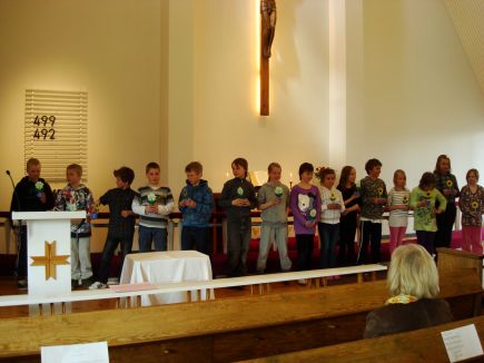 ![]() 10-vuotissynttärit kirkossa!Perjantaina 6.5.2011 vietettiin kirkossa 10-vuotissynttäreitä joita ovat 2001 vuonna syntyneet. Heistä kaikki 15 oli hienosti paikalla. Mukana juhlahumussa olivat eskarit, 1 luokka ja 2 luokka. Ja olihan yksi vanhempikin tullut mukaan. Aluksi laulettiin leikkien virsi 499 Jumalan kämmenellä. Tämän jälkeen meidän pappimme Olavi piti hartauden. Sitten laulettiin leikkien Hyvä mieli-laulu jossa hyvä mieli täytti pään ja silmät olivat selällään ja korvat höröllään ja suu oli töröllään. Tämän jälkeen 1 luokkalaiset esitti onnittelulaulun 10-vuotiaille: Kirje kuulle. Siinä laulettiin ketunpojasta joka kaipasi ystävää. Sitten vuorossa oli virsi 492 Ystävä sä lapsien. Leikittiin uusi Auringonkukka-laulu, jossa pieni siemen maahan upposi ja kohta sieltä varsi kohosi. Aurinko lämmitti ja puhkesi kukka nupustaan. Lastenohjaajamme Kirsi piti juhlapuheen 10-vuotiaille jonka jälkeen 10-vuotiaat pyydettiin eteen yksi kerrallaan ja jaettiin kukkakippo josta toivottavasti kasvaa kaunis kukka kesän aikana. Se mikä kukka sieltä kasvaa niin jäi 10-vuotiaille arvailujen varaan. Jospa saisimmekin sitten kesän päätteeksi kuvaa edes yhdestä kukasta. Sitten oli vuorossa onnittelulaulu 10-vuotiaille. Sitten päästiin nauttimaan Lähetyksen käsityöpiirin naisten tekemää aivan ihanaa kakkua ja mehua! Kiitos kaikille mukanaolijoille ja Iso Kiitos käsityöpiirin naisille herkullisesta kakusta. Toivotamme vielä kerran onnea kaikille 10-vuotiaille ja Taivaan Isän siunausta! Auringonkukka-laulu ”Pieni siemen maahan uppoaa, kohta sieltä varsi kohoaa. Aurinko kun vielä lämmittää, puhkee kukka nupustaan. Auringonkukka, auringonkukka, kaunis, keltainen, suuri iloinen Hyvä Jumalamme valon tuo, armonsa lapsillensa suo. Yhdessä nyt kiitämme sinua: hoidat kukkaa ja minua. Auringonkukka, auringonkukka, kaunis, keltainen, suuri iloinen” |