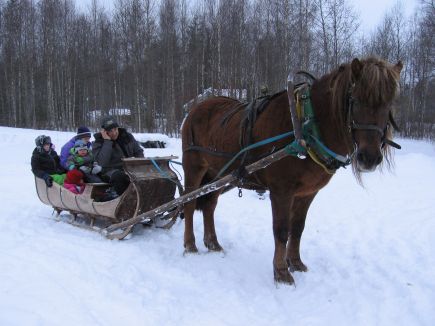 Vieraaksemme saimme Kumpulasta kotoisin olevan suomenhevosen, jonka kyydissä saimme nauttia rekiajelusta ja kavioiden kopseesta. Pulkkamäki oli kovassa käytössä ja makkarat maistuivat tuiskusessa säässä. |