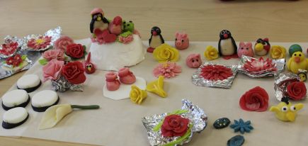 ![]() MARSIPAANISTA MONEKSIHuhtikuun viimeisenä lauantaina Kyyjärven maa- ja kotitalousnaiset järjestivät kakunkoristelukurssin. Kotitalousneuvoja Kati Huovinen opasti kurssilaisia. Koristeita muotoiltiin sekä marsipaanista että sokerimassasta. Ja monenlaista kuviota massoista saatiinkin syntymään. Tässä tapauksessa kuvat kertovat enemmän kuin tuhat sanaa. |