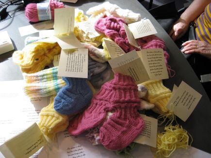 PS. Kuvat kertovat ompeluseuravierailustamme Betsetillä 19.4. Kiitos kaunis! Uudet Kyyjärvi-vauvat saavat tossut lahjaksi yhdistykseltämme. Katso viimeistä lisäkuvaa: laajennamme tuotevalikoimaamme pipoihin. Ennen vanhaan vauvalla pidettiin aina myssyä. Kuvassa on HS:n artikkeli myssyideasta Jorvin synnytysosastolla.