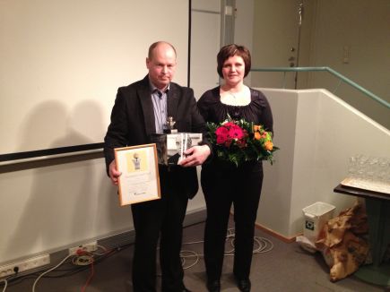 ![]() Vuoden yrittäjä Esa Korpeinen OyKyyjärven yrittäjät pitivät syysjuhlan ja sääntömääräisen syyskokouksen perjantaina 30.11.12 Lappajärven Kivitipussa. Vuoden Yrittäjänä palkittiin Esa Korpeinen. Kokouksessa valittiin puheenjohtajana jatkamaan Jaakko Uusisalo. Hallitukseen saatiin jopa kolme uutta jäsentä eli Eija Maukonen, Jukka Viertamo ja Jari Kantonen. Hallituksessa jatkavat Anita Collin, Tuula Lillvis, Lauri Lahtinen, Jouni Saukko, Pasi Kirvesmäki, Jari-Pekka Uusisalo ja Kai Oinonen. Kokouksen jälkeen julkaistiin Vuoden yrittäjä 2012 ja tänä vuonna yhdistys oli päättänyt palkita Esa Korpeinen Oy:n. Esa Korpeinen on pitkänlinjan yrittäjä. Hän aloitti vuonna 1983 isänsä Vilho Korpeisen taksia ajamaan ja 1993 hän jatkoi toimintaa perustamalla oman yrityksen. Yritys muuttui 2001 osakeyhtiöksi. Taksiyrittäjyys jos mikä on asiakaspalvelua ja siinä Esa Korpeinen on onnistunut hienosti. Pienellä paikkakunnalla taksia tarvitaan moneen tarpeeseen. Esa Korpeisen mielestä parasta yrittäjyydessä on tietynlainen vapaus toimia ja päättää asioista. Yrittäjänä jaksaa, kun saa asiakkailta hyvää ja rakentavaa palautetta. Lisäksi tärkeää on hyvät yhteistyökumppanit sekä hyvät "rengit" eli työntekijät, jotka tarvittaessa voivat yrittäjää tuurata autoilussa. Esa kertoi, että vapaa-aika muodostuu monesta eri sektorista eli perheestä, maa-/metsätöistä, mutta joskus jopa liikunnallisista harrastuksista kuten laskettelusta ja hiihtämisestä. Mahdollisuuksien mukaan syksyllä käydään metsällä ja kevättalvella pilkkiäkin uitetaan avannossa. Tyypillistä hänen vapaa-ajalle on se, että silloin ei maata laakereilla vaan tehdään jotakin vaikka pienitään puita!!! Perheen rooli yrittäjälle on tärkeä. Perhe on tietynlainen voimavara. Esan työaika on säännöllisen epäsäännöllinen, joten ne hetket kun saa olla perheen kanssa ovat tärkeitä. Pojat Elias ja Eemeli kyllä pitävätkin huolen tuolloin, että iskän huomio varmasti saadaan. Kuvassa Esa ja puoliso Leena Pölkki. Onnittelut Vuoden Yrittäjälle 2012 ja menestyksellistä jatkoa! |