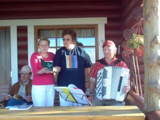 Lintulahden Riitta ja Pillikon Sisko toimivat laulattajina ja Turpeisen Pekka säestäjänä kun Lintulahden Liisan ja Esan rannassa laulettiin yhteislauluja keskiviikkoiltana 3.8.