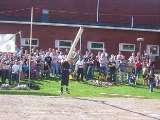 ![]() Hirrensyöksyn Suomenselän mestaruuskilpailut messuillaHirrensyöksy on vanha viikinkilaji, Suomessa lajissa on kilpailtu 25 vuotta. Suomenmestaruuskilpailuja myös järjestetään. Kivijärveläinen Hannu Ahonen kertoi, että sääntöjen mukaan hirsi on 4 metriä pitkä ja 20 kiloa painava. Virallinen kilpailuhirsi on tyvipäästä 16 cm ja latvapäästä 8 cm paksu. Käytännössä latvatukki käy. Ahosen mukaan hirrensyöksy kilpailun virallisia sääntöjä ei helpolla löydy mistään. Nyt asia on korjattu ja säännöt löytyvät helposti Nopola Newsistä. Suomenennätys lajissa on 10,06 metriä. Keskeinen sääntö heittotekniikassa on, että otetaan kiinni hirren latvapäästä ja heitetään. Tulos mitataan siitä, missä hirren tyvipää ottaa maahan. Heiton jälkeen hirren on pyörähdettävä pituussuunnassaan ympäri. Kivijärven kisoissa käytetty hirsi oli kakkosnelosta, joten se selittää saavutetut tulokset. Hirrensyöksyn Suomenselän mestaruuskilpailujen tulokset Miehet (hirsi 4m/20kg)