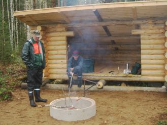 Kalettomalle pystytettiin laavu yty-työnäEipä ollut helpommasta päästä laavun siirto kalettoman rantamaisemiin. Heikki Hakkarainen ja Kari Pihlajamaa makkaran paistossa valmiilla nuotiopaikalla.