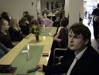 ![]() Nuoria koolla kirkossaPejantai-iltana 4.11.2005 oli Nuorten ilta kirkossa Seurakuntasali ja eteinen oli tupaten täynnä Kyyjärven ja lähiseudun nuorista.Alkuhartauden piti khra Olavi Vallivaara. Alustuksen, ryhmätyön ja loppuhartauden piti pastori Markku Joensuu Alajärveltä. Hän käsitteli alustuksen aiheessaan aikamme ilmiöitä: Tietokonetta, verkossa surffailua,internettiä ym.. Tietokone on hyvä apuväline, mutta napin painaluksen takana on hyvä ja paha.Meidän on tehtävä jatkuvasti valintoja ja kuunneltava omantuntomme ääntä. Alustuksen ja keskustelun välillä laulettiin virsiä ja lauluja ja nautittiin tarjoilusta. Läsnä oli 100 nuorta. Alustaja on kuvassa etualalla. |