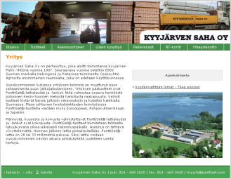 ![]() Kyyjärven Saha Oy:n www-uudistusLähes sata vuotta toiminut Kyyjärven Saha Oy uudisti Internet-ilmettään. Kyyjärven Saha Oy on jo pitkään Kyyjärvellä toiminut yritys, joka aloitti toimintansa niinkin aikaisin kuin vuonna 1907. Paljon on saha ehtinyt tarjota paneelia, lankkua ja listaa niin paikallisille kuin muillekin asiakkaille. Tietotekniikka yrittäjien käyttöön -hankkeen kautta Kyyjärven Saha Oy päätti tehdä www-sivujen uudistamisen. Sivuille laitettiin tuote-esittelyjen lisäksi mm. lattioiden asennusohjeita, jotka varmasti kiinnostavat paljon. Kyyjärven Saha Oy:n uudet Internet-sivut löytyvät tutusta osoitteesta www.ponttiset.com. |