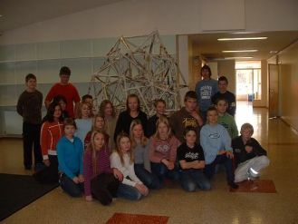 ![]() Mikä ihme ja kumma??Sanomalehdistä ja maalarinteipistä tehty rakennelma. Pari viikkoa sitten kutoset saivat fysiikan tehtävän: rakentaa putkirakenne. Pojat alkoivat tehdä pientä, muutaman sanomalehtirullan kokoista rakennelmaa. Sitten päätettiin, että putkirakenteesta tehdään niin iso kuin mahdollista. Sen jälkeen kaikki kutoset ovat aina silloin tällöin olleet tekemässä tehtäväänsä. Sanomalehtiä on kulunut vaikka kuinka paljon, ja vaikka niitä oli paljon koulun varastossa ja kirjastossa, on joidenkin silti pitänyt tuoda lisää lehtiä kotoaan. Maalarinteippiä on mennyt myös, joidenkin mukaan jopa 12 rullaa. Kutoset ovat saaneet tehdä rakennelmaansa fysiikan tunneilla, välitunneilla ja tytöt ovat tehneet sitä myös käsityötunnilla. Kaikki ovat tykänneet rakentaa ”hökötystä”, kuten he itse sanovat. Hauskinta rakentamisessa on ollut, ettei ole tarvinnut mennä pakkasilla ulos, on saanut lintsata tunneilta ja on saanut olla paperiputkisotaa. Koko rakennelman aloittajien, Villen ja Paavon mielestä hienointa oli saada ensimmäinen kolmio valmiiksi. Hankalinta oli viimeisten rullien saaminen paikalleen, koska rakennelmalla alkaa olla korkeutta yli kaksi metriä, ja se on myös niin leveä, että keskelle ei meinaa ylettyä. Vaikeaa oli myös aloittaminen, ja toisten mokien korjaaminen. Yksi asia rakentamisessa oli, josta kutoset eivät tykänneet: siivoaminen. Ulkopuolisetkin saivat maalarinteipeistä osansa, kun niitä löytyi sukkien ja kenkien pohjista. Tarkoitus oli tehdä rakennelmasta niin korkea, että se on kattoon asti, mutta rakennustarvikkeet loppuivat kesken. Lopputulos näyttää joidenkin mielestä epämuodostuneelta pyramidilta, joidenkin mielestä vain paperikasalta. Riitta Raivio sanoi, että putkirakenteesta tulee mieleen Eiffel-torni, koska sekin on tehty kolmioista. On myös hienoa, että oppilaat saavat tehdä jotain käsillänsä, ja että sanomalehdetkin menevät hyötykäyttöön. Yläasteen kuvaamataidon opettaja Tapio Heiskasen mielestä kolmiulotteinen rakentaminen on kiintoisa lisä kuvataiteessa, ja että avaruusmallien tekeminen auttaa hahmottamaan maailmaa paremmin. Kun usein pysytään pienissä kuvioissa, niin nyt kun rakennelma on isompi kuin ihminen, se antaa hienon tilavaikutelman. |