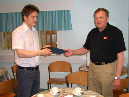 ![]() 30 vuotta täynnä30 vuotta sitten eli 14.6.1976 Erkki Sorsamäki aloitti rakennustarkastajan tehtävät Kyyjärven kunnan palveluksessa. Kyyjärven kunnanjohtaja Mikael Palola luovutti Erkki Sorsamäelle Suomen kuntaliiton kultaisen ansiomerkin pitkäaikaisesta toiminnasta kunnallisessa palveluksessa. |