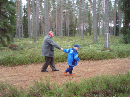 ![]() Sisupäivä HarsullaHuivi tiukasti isän silmille. Lähdetään kävelylle, minä ohjaan ja autan sinua. Eläydytään hetki näkövammaisen arkeen. Sidotuin silmin joutuu turvautumaan kuulo- ja tuntoaistiinsa ja luottamaan avustajaansa. Autettava ja avustaja tekee tiivistä yhteistyötä, muuten ei suju. Harsunkankaalla vietettiin lauanaina 30.9. tovi tutustuen sisupartiointiin. Opastusta tässä asiassa meille tarjosi partiojohtaja Hannes Järvenpää Jyväskylästä. Hanneksen lippukunta on Reippaat Pojat. Hannekselle ja hänen partiokavereilleen tämä oli ensivierailu Kyyjärvelle. Reippaita Poikia odotellessamme maistelimme nokipannukahvia ja nälkäisimmät paistoivat makkaraa. Hannes kertoi meille perusasioita sisupartioinnista, leikitti ja teetti erilaisia tehtäviä, joissa asioita piti ajatella normaalista näkökulmasta poiketen. Sisupartiolaiset ovat aisti-, liikunta- tai kehitysvammaisia partiolaisia. Sisupartion idea on Baden-Powellin ajoilta, ja levinnyt kansainvälisesti kuten muukin partiotoiminta. Sisupartiolaisten tunnuksena on sisukkuutta kuvaava sammakko. Tarina kahdesta sammakosta: Eräänä päivänä ne hypellessään sattuivat löytämään kerma-astian. Ne kurkistivat astiaan uteliaina ja putosivat sinne. Toinen sammakoista ajatteli kerman olevan jotakin kummallista nestettä, jossa sammakon oli mahdotonta uida. Niinpä se ei yrittänytkään. Ja kun pelastajaa ei tullut, se vajosi pohjaan ja hukkui. Toinen sammakko ei antanut periksi. Se yritti uida ja potkia kaikin voimin. Välillä se vajosi mutta ponnistautui taas pinnalle. Tätä jatkui tunnista tuntiin. Ja kuinka kävikään? Äkkiä se tunsi jalkojensa alla kiinteää ainetta ja pääsi hyppäämään pois astiasta. Kerma oli sen ponnistellessa kirnuuntunut voiksi. Sisukas sammakko pelastui.