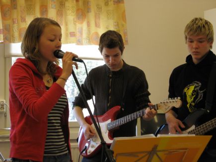 ![]() Sairaanmukavaa bändisoitantaaIso-Nopolan koulun oppilaat soittavat välituntisin ja bändikurssilla. Viime vuonna Kuusen Jarin käynnistämä bänditoiminta on jatkunut Iso-Nopolan koululla. Pidämme ns. virallisia harjoituksia tiistaisin koulun jälkeen kahdella eri porukalla, koska ei ole mitään järkeä, että on esim. kaksi rumpalia kerralla eikä soittimiakaan olisi kaikille halukkaille, selvittää Tomi Nahkala. Olli Oikari, musiikin opettaja, toimii ohjaajana bändikurssilla. Oppilailla on lupa soittaa aamuvälkällä ja pitkällä ruokatauolla. Koulunkäynninohjaaja Anneliina Keisala on vastuuaikuinen. "Taitojen kehittyminen on aivan ällistyttävää. Monet aloittivat vasta syksyllä ja ovat nyt taitavia", ihastelee Aksu. Oppilaat ovat vastuullisia ja asiallisia: soittimet ja paikat pidetään kunnossa. Heidi Honkonen, 8.-luokkalainen, on aina tykännyt laulamisesta: "Kaikki käy, paitsi hevi. Ehkä tällä hetkellä lempilaulubiisini on Turvakytkimen Täydellistä." Se soikin juuri taustalla. Eteläkarin Ville 7.lk on rumpali: "On tosi mukava että meillä on mahdollisuus soittaa sekä välituntisin että bändikurssilla." Ville ja Nahkalan Tomi 8.lk ovat soittaneet jo ala-asteikäisinä. Musiikkia voisi tehdä työkseenkin, tunnustavat pojat. Meidän porukan nimi on Bändi. Kokoonpano on vaihdellut: Ville on siis rummuissa, Tomi soittaa kitaraa, Oikarin Amanda 8.lk bassoa ja Honkosen Heidi laulaa. Sami Ohranen 8.lk kertoo aloittaneensa soittamisen vasta syksyllä. Taidot kehittyvät harjoittelemisen myötä. Heilläkin on bändi Exoduss, jossa Janne Kuusi 8.lk ja Tatu Back 8.lk soittavat sekä kitaraa että rumpuja, Tuomas Turpeinen 8.lk kitaraa, Sami Ohranen bassoa ja Elina Honkola 7.lk laulaa. "Ohjelmistoon" kuuluu pop, rock ja iskelmäkin. Meillä on tavoitteita ja haaveita, paljastaa Anneliina, nuotin tuoja, mukana soittaja, turva ja tuki. Oppilaat ovat hankkineet omia soittimia ja ovat valmiita tekemään töitä harrastuksensa eteen. Bändikämppä tarvittaisiin!!! PS. Soittavat sairaanhyvin, tuumasi Toni. Oppilaat lähtivät tunneilleen, Toni NopolaNewsiin jatkamaan työharjoitteluaan ja minä naputtelemaan tätä. PS. Koulussa on kivaa! nimim. "Kokemusta on". |
