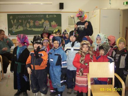 ![]() Noitaoppilaat valmiita virpomaanNopolan esikoulun noitaoppilaat lähtivät kiirastorstaina harjoittelemaan virpomistaitojaan Värivelhon ja Noitamummelin kanssa. Ennen virpomisreissulle lähtöä harjoiteltiin oikeaa lentoasentoa luudan kanssa, rämäkkää naurua ja taikomisasentoja. Noitaoppilaat kun oppivat nopeasti, niin matkaan päästiin lentoaikataulun mukaisesti klo 11.20. Matkalla kohti vanhainkotia nähtiin lentäviä tipuja ja lentäviä peltilehmiä, joita kyllä varottiin ja katsottiin suojatiellä molempiin suuntiin. Vanhainkodin pihassa luudat laitettiin seinät varteen ja sitten ilahdutettiin vanhuksia virpomisloruilla ja -vitsoilla. Lentomatka kohti Touhulaa sujui jo mallikkaasti ja iloisen pääsiäisen toivotukset kajahtivat ilmoille tottuneesti. Touhulaan oli lennähtänyt kevätharakka upeine sulkineen, joka yritti vaihtaa miniluutansa Värivelhon oikeaan taikaluutaan. Onneksi noitaoppilaat eivät suostuneet vaihtokauppaan. Ja päälle naurettiin oikeat noitanaurut. Virpomispalkka nautittiin sitten Nopolan koululla ja taisi riittää vielä kotiakin viemisiä. Kiitos Kivirannan ja Touhulan väelle lämpimästä vastaanotosta! Nyt kun harjoitukset takana niin eiku virpomaan!! |