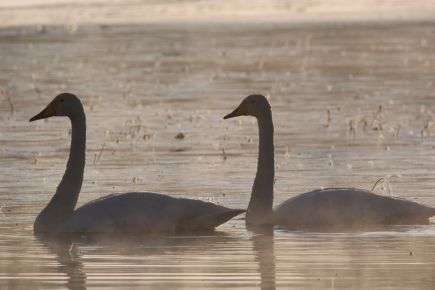 ![]() Kirvesjärven joutsenet lähikuvassaKirvesjärven joutsenet lähikuvassa. Antero Ohranen kävi kuvaamassa ammattitaidolla Kirvesjärven joutsenpariskuntaa huhtikuun neljännen päivän aamuna kirpakkaassa 12 asteen pakkassäässä. Joutsenet lipuivat tyyväisen näköisenä pitkin usvaisen järven pintaa sulat pörhöllään. |