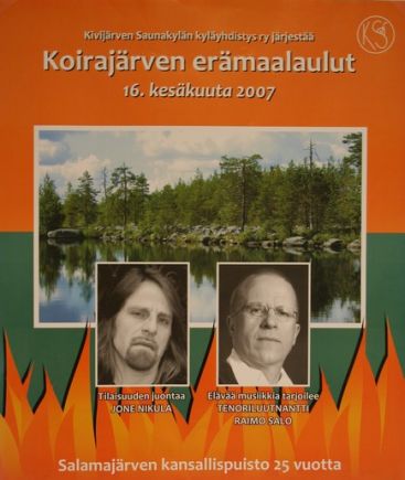 ![]() Koirajärven erämaalaulut 16.6.2007Erämaalaulujen vastuullisena järjestäjänä tapahtumalle on Kivijärven Saunakylän kyläyhdistys ry. Tapahtuman avaussanat lausuu maakuntajohtaja Anita Mikkola. Tilaisuuden juontaa tv:stä tuttu Jone Nikula. Illan mittaan esiintyvät myös Saarijärven Harmonikkakerho, sekä Tenoriluutnantti Raimo Salo joka laulattaa yleisöä Siniristi-orkesterinsa kanssa. Tilaisuutta tukevat mm. lähiseudun kunnat sekä lukuisat yritykset ja yhteisöt. Tilaisuuteen sisäänpääsymaksu on aikuisilta 7€, lapset alle 10v 3€. Salamajärven Kansallispuisto täyttää muuten tänä vuonna 25v. Ohjelma tilaisuuteen: