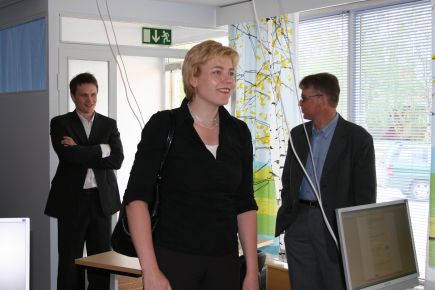 ![]() Kansanedustaja Henna Virkkunen vieraili KyyjärvelläVirkkunen tutustui Kyyjärven kunnan ajankohtaisiin asioihin sekä vieraili Kauppakeskus Paletissa, Betsetillä, Kyyjärven Sahalla, Kivirannassa sekä Nopola Newsissä maanantaina 11.6.2007. Kauppakeskus Paletissa kansanedustaja tapasi kunnanjohtaja Mikael Palolan, kunnanvaltuuston puheenjohtajan Maija Uusisalon, Ossi Tammisen ja Tuija Vähämöttösen. Kunnan edustajat keskustelivat kansanedustajan kanssa kuntalaisia kiinnostavasta eduskunnan PARAS-hankkeesta (palvelurakenne uudistushanke), johon Virkkunen kuuluu. Paletin jälkeen Virkkunen kävi tapaamassa Nopola Newsin "arvovaltaisia" edustajia Aaro Toppista, Veikko Huumarkangasta ja Irma Mäkelää. Toppinen esitteli kansanedustajalle Nopola Newsin syntyä, toimintaa ja tulevaisuuden kuvioita. Edustaja kuunteli esitystä mielenkiinnolla ja kuulemma seuraa Nopola Newsiä säännöllisesti. Nopola Newsistä matka jatkui Betsetille, jossa toimistusjohtaja Hannu Löytönen kertoi edustajalle Betsetin nykytilanteesta, laajennuksesta sekä tulevaisuuden toimista. Betsetiä kiinnosti Virkkusen kuuluminen ympäristövaliokuntaan, jolle kuuluu Betsetin toimialaa lähellä olevat kaavoitus- ja rakennusasiat. Kyyjärven Saha oli vierailun seuraava kohde. Sahan toimitusjohtaja Tapio Mäntynen esitteli 100-vuotiaan sahan historiaa sekä nykymenoa. Vierailun lopuksi Virkkunen kävi Kivirannan vanhainkodilla tapaamassa sen asukkaita ja hoitohenkilökuntaa. Kansanedustajan vierailu sujui onnistuneesti, ja kaikki osapuolet ovat tyytyväisiä päivän antiin. |
