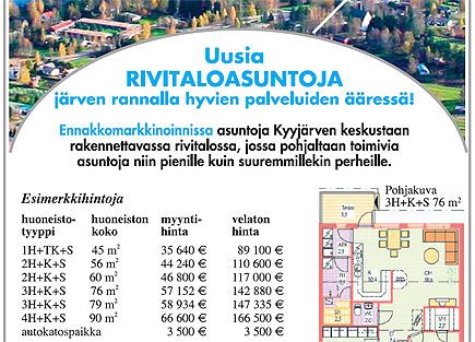 ![]() Uusia rivitaloasuntoja ennakkomarkkinoinnissaJärven rannalla hyvien palveluiden ääressä! Kyyjärven keskustaan rakennettavan rivitalon ennakkkomarkkinointi on käynnistynyt. Toimivista pohjaratkaisuista löydät asunnon niin pienelle kuin suuremmallekin perheelle. Oheisista linkeistä pääset tutustumaan pohjaratkaisuihin ja hintoihin. Varaa omasi heti. Tiedustelut ja varaukset: Rahoitus ja RS-pankki Kyyjärven Osuuspankki. |