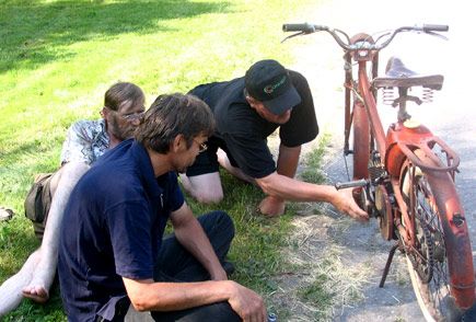 ![]() Pappatuntureiden kokoontumisajo IIIja muutkin vanhat menopelit ja vehkeet markkinoille mukaan. Pappatuntureita tulossa Petäjävedeltä saakka. Parina viime vuonna suurta mielenkiintoa ovat herättäneet kaikenlaiset vanhat menopelit ja koneet. Vanhoja autoja, traktoreita, mopoja, moottoripyöriä, maamoottoreita ja paljon muuta oli jo viime vuonna mukana. Eniten katseita taisi viime vuonna kerätä Peuran Markun huippuhieno Chrysler Royal Coupe vuosimallia 1940 (ks. julkaisuarkisto heinäkuu 2006). Tänä vuonna on luvassa Pappatuntureita Jyväskylän kupeesta Petäjävedeltä saakka. Petäjäveden porukka, 10 - 15 henkeä, lähtee reissuun jo hyvissä ajoin ja yöpyvät tullessaan Lomakouherossa. Lauantaina markkinoilla on ohjelmassa mm. 25 metrin hitausajo ja lankulla-ajo. Sitä ei tietenkään kerrota kuinka korkealle lankku on nostettu vai onko nostettu ollenkaan. Se on tultava paikanpäälle katsomaan. Oman mausteensa Pappatunturisoppaan tuovat varmasti Petäjäveden porukan värikkäät kertomukset kyseisen kulkupelin historiasta. Se, onko kyseessä tarua vai totta, jää itsekunkin kuulijan arvioitavaksi. Petäjäveden Pappatunturit ovat siis tulossa, mutta löytyykö läheltä tai kauempaa muita vanhoja menopelejä. Jos löytyy, niin tervetuloa. Tiedä vaikka itse P.A Turpeinen sattuisi Esson tankilla ajokkisi tankkaamaan. No, se on ainakin varma, että tankilla on jonoo... Tervetuloa Ps. Hyvän Pappatunturikuvan puutteen johdosta, pääkuvassa suomalainen "asiantuntijaryhmä" pohtimassa ranskalaisen insinöörityön taidonnäytteen käyntiongelmia kesällä 2005. |