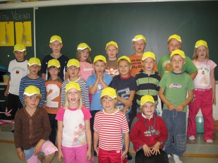 23.8.2007 Pirkko KotanenIf- vakuutusyhtiö lahjoitti ekaluokan oppilaille keltanokka liikenteessä lippikset.