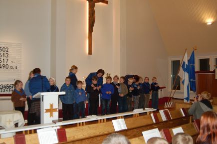 ![]() Partiokirkon ja johtajapalaverin tunnelmiaMoni pieni koki kirkossa juhlahetken antaessaan omaa partiolupaustaan. 14 uutta sudenpentua antoi oman sudarilupauksensa. Tästä se partiotaival alkaa. Se miten pitkä ja antoisa taipaleesta tulee, sen näyttää aika. Joku voi harrastaa vuoden, toinen viisi, joku jopa viisitoista vuotta ja jollekkin partio on sydämenasia koko eliniän. Eilen kirkossa pienimmät näkivät niitä isompia, jotka ovat olleet mukana jo vuosia. Partiopaitoja ihailtiin. Ja uusi huivi odottaa sitä, koska se saa "retkikasteen" eli tuoksuu kotiin palatessa savulta. Partiolupauksia annettiin seitsemän. Lopuksi vielä jaettiin luokkasuoritus merkit viidelle nuorelle. Kahvituksen ja siistimisen jälkeen päästiin aloittamaan johtajapalaveria, jossa mukana oli johtajia ja vanhempainneuvoston jäseniä. Keskusteltiin johtajien jaksamisesta, yllekirjoittaneen hartiat eivät meinaa jaksaa kantaa, huoli myös muiden johtajien jaksamisesta. Kukaan meistä ei pysty tekemään enempää oman perhe/työkuvioiden takia. Partiojohtaja Karppa Jyväskylästä on kiteyttänyt asian näin: Se mistä lippukunnassa on pula, on se sama, mikä takaa toiminnan laadun ja jatkuvuuden eli aikuisikäiset johtajat. Kyypartio vielä pyörii jotenkin toimivilla johtajilla jotka viikkotoiminnassa mukana. Mutta myös toiminnan tukijoita tarvitaan eli niitä aikuisia jotka voivat lähteä esim. valvomaan yön yli retkeä tai vastaamaan kesäleirin huollosta tai partiokirkon kahvituksesta. Eli eivät sitoudu pestiin viikottain vaan joskus. Ja samalla antavat hieman hengähdystaukoa toimiville johtajille. Tästä lisää myöhemmin. Tänä syksynä viikkotoiminnassa on ollut mukana 54 7-18 vuotiasta lasta ja nuorta. Edelleen haluaisimme tarjota heille partiotoimintaa myös jatkossa. Lippukunnasta löytyy kyllä monenlaisia pestejä aina siitä lippukunnanjohtajasta alkaen. Partiossa tarvitaan monipuolista osaamista ja erilaisista asioista kiinnostuneita ihmisiä. Eli tarkoitan sitä, että oletpa sitten asentaja, insinööri, ompelija tai minkä alan osaaja tahansa, sinua tarvitaan. Tärkeää on olla yhtenä lenkkinä toiminnan mahdollistajana, nuoren kasvamisen tukena.