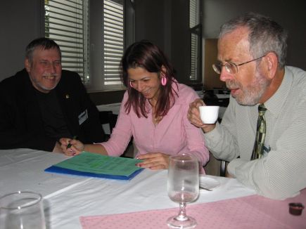 ![]() "Ädj, kättoo, haarom" - Nopolanews IILähtölaskenta: yks,kaks,kolme. Jokaiselle Fazerin konvehdit ja Nopolanews-käyntikortti. Ke 24.10. klo 14.30 H-hetkemme. Tila tuli täyteen ja oven suussakin riitti kuuntelijoita. Esittelimme Kyyjärven: vähän historiaa, elinkeinoelämää, aktiviteettejä; sitten Nopola News -projektimme 1.1.-31.8.2005 tavoitteet, informaatioketju ja tulokset, nykytilanne ja tulevaisuus. Aamupäivällä Unkarin Lieder-hankkeiden avustusorganisaation presidentti Katalin Molnar sanoi puheenvuorossaan, että perinteiden tallentaminen ja inhimilliset suhteet pitäisi olla yhteinen arvopohja. Pystyin lainaamaan sitä meidän esityksemme loppupuolella ja näin sitomaan käytäntömme hänen ajatuksiinsa. Meidän viimeinen powerpoint -sivumme: "Me kaikki tiedämme, mitä maailmalla tapahtuu TV:n, radion, internetin ja sanomalehtien välityksellä. Mutta kuka tietää, mitä tapahtuu lähellämme. Me tiedämme, Kyyjärvellä! Thank you. Köszsönöm! Englanninkielinen esityksemme tulkattiin unkariksi. Ihmiset olivat kiinnostuneita. Kommentoimaan tulivat ruotsalaiset, virolaiset, englantilaiset ja hollantilaiset. Seuraavina päivinä monet tervehtivät ja hymyilivät: muistivat tietopakettimme. Ehkä unkarilaisilla tavallisilla ihmisillä ei ollut kielitaitoa tulla kysymään, mutta aina heillä on mahdollisuus pyytää lisätietoja sähköpostitse. Se olikin sovittu käytäntö. Ja onhan heillä powerpointimme. Kuvassa vasemmalla tyttäreni Ikka (!!!), ulkomaalaisista vieraista huolenpitävä Eva Bardos ja oikealla todella hauska John Dowsett Englannista. John esiintyi meidän jälkeen aiheena Small Grants Schemes in Leader - Contrabution to Quality of life" (pienehköt Lieder-avustukset elämän laadun parantamiseksi). Hän ihasteli Nopolanewsin ideaa, oli muutenkin Suomen tuttu: oli kuulemma joskus kauan sitten ollut Lieksassa heinäpellolla hommisssa. PS. Opettelin numerot 1 - 9 unkariksi, jotta pystyn tekemään sudokuja paikan päällä!! Köszsönöm (lausutaan kösönöm) = kiitos. |