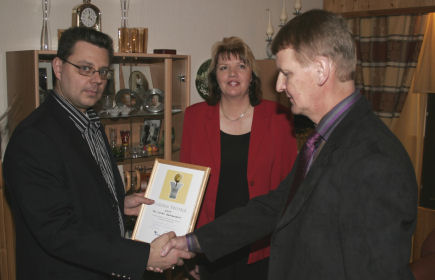 ![]() Tmi Juhani Halmesaari Vuoden Yrittäjä 2007Kyyjärven Yrittäjät ry palkitsi Juhani Halmesaaren vuoden 2007 yrittäjänä. 28 vuotta yrittäjänä ollut Juhani Halmesaari tekee palaturveurakointia 8 työntekijän voimin. 1980 syntyi Juhanille toive jäädä kotipaikkakunnalle asumaan ja tekemään töitä ja tällöin syntyi ajatus yrittämisestä ja traktoriurakoinnista. Hän aloitti palaturveurakoinnin Vapon Savonnevalla ja teiden kunnossapito oli myös yhtenä tehtävänä. Työaika suolla on varhaisesta keväästä myöhäiseen syksyyn ja talvet lumityöt ja kuormaukset pitävät traktorit työssä. 1990-luvun alussa työ muuttui kokonaisurakoinniksi ja työnkuva laajeni. Kalustoa kasvatettiin ja kehitettiin ja työntekijä määrä alkoi lisääntyä. Ympäristövaatimuksen turvesoilla muuttuivat ja lisäsivät työtä. Turvetuotanto on monien palasten yhteensovittamista. Tärkeää on hyvä ja toimiva kalusto, huolto, työporukka, työnjohto, aliurakoitsijat ja kuljetus. Juhani Halmesaari kiittää perhettään ja puolisoaan Airaa, joka toimii myös sihteerinä. He ovat huolehtineet siitä, että työhön ja yrittämiseen ei uppoa liiaksi. Yrittäminen on hänen mukaansa mukavaa ja vapaata, saa itse suunnitella työnsä ja toteuttaa itseään. Turvetuotannon tulevaisuuskin näyttää valoisalta, joten tästä on hyvä jatkaa. Kyyjärven Yrittäjät toivottavat menestystä Vuoden yrittäjälle! |