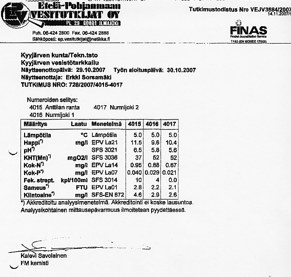 ![]() Vedenlaadun tarkkailua KyyjärvelläSyksyn aikana on Kyyjärven vesistöistä otettu vesinäytteitä . Kuva Nopolanjoen sillan yläpuolelta otetusta näytteenot- topisteestä Vesinäytteitä otettiin kahdella eri kerralla. Ensimmäiset viisi näytettä otettiin 1.10.2007 Nopolanjoesta, Koskiniemen sillan yläpuolelta , Nurmijoesta Vaasantien sillan alta, Vorspakanjoesta Vaasantien sillan alta, Kortejoesta Pölkintien sillan alta Pekkasenjokisuusta läheltä Kyyjärveä. Toisella kertaa 29.10.2007 otettiin kaksi näytettä Nurmijoesta Kiventien sillan alta, toinen Nurmijoen näyte Pääkylän sillan kohdalta, sekä yksi näyte Kyyjärvestä Anttilan rannan vieressä olevasta uimarannasta. Tulokset löytyvät oheisista linkeistä vesinäyte 1 ja vesinäyte 2 Seuraavassa tulosten tarkastelua ja muitakin asioita vesistökuormituksesta, vesistöjen tilan parantamisesta: Tutkitut vesistöt ovat melko happamia ja niiden pH-arvot ovat aika tyypillisiä suoperäisellä alueella. Fosforipitoisuuden perusteella vesistöt voidaan luokitella rehevöityneiksi. KHT:t olivat melko korkeahkoja. KHT kuvaa näissä tapauksissa lähinnä humuksen määrää ja ruskeissa vesistöissä humusta yleensä on runsaasti. Jokien virtaamat olivat sateista johtuen runsaita. Virtaamat lisäävät myös kiintoaineen kulkeutumista vesistöön. Bakteerien osalla ensimmäisellä näytteenottokerralla yhdessä näytteessä oli fekaalisten sreptokokkien osalla lievää ylitystä sosiaali- ja terveysministeriön päätöksen mukaisen uimakelpoisen veden laatuluokitukseen verrattuna. Toisella näytteenottokerralla kaikki näytteet täyttivät uimiseen sopivan veden laatuvaatimukset. Nämä tulokset ovat yksittäisiä näytteitä eikä niiden perusteella voi tehdä pitkälle meneviä johtopäätöksiä. Normaalien puhdistettujen jätevesien bakteeripitoisuudet liikkuvat suurusluokkaa useita kymmeniä tuhansia kappaleita desilitraa kohti. Kyyjärvelle tulevaan uuteen jätevesipuhdistamoon on suunniteltu jätevesien suodatus ja bakteerien poisto ultraviolettisäteilytyksellä. Tällä päästään bakteerien osalla lähes 100 % poistotulokseen. Uuden jätevedenpuhdistamon valmistuttua kirkonkylän taajaman jätevesien käsittely parantuu oleellisesti . Puhdistamon rakentaminen alkanee ensi keväänä ja valmistuu vuoden 2009 helmikuun loppuun mennessä. Nykyiset maatalouden tukijärjestelmät pyrkivät ohjaamaan ja kannustamaan ympäristöä mahdollisimman vähän kuormittavien ja luonnon monimuotoisuutta ylläpitävien viljelyjärjestelmien käyttämiseen. Ympäristöön kohdistuvat lakisääteiset hoitovaatimukset perustuvat EU:n nitraatti-, pohjavesi- ja puhdistamolietedirektiiviin ja niitä toteuttaviin kotimaiseen lainsäädäntöön. Käytännössä tämä tarkoittaa sitä, että saadakseen tukea viljelijä joutuu sitoutumaan ympäristötuen ehtoihin ja jos hän ei niiden mukaisesti toimi heti ensimmäisestä laiminlyönnistä seuraa sanktio. Tukea vähennetään. Kukapa haluaisi pienentää palkkaansa?. Tuskin kukaan.Määräykset koskevat lannan varastointia ja käsittelyä, pohjaveden suojelua sekä puhdistamolietteen käyttöä maataloudessa. Valtaosa aktiiviviljelijöistä jotka aikovat jatkaa maataloutta ovatkin jo toteuttaneet lannan varastointi- ja käsittelytilat vaatimusten mukaiseen kuntoon. Kyyjärven rannat ovat matalia samoin osaltaan valuma-alue. Vedenpinnan korkeuden vaihtelu on suuri ja tulvien alle saattaa jäädä keväisin viljelysmaita. Suojavyöhykkeiden lisäämisellä -ja kosteikkojen perustamisella voisi vielä saada parannusta nykytilanteeseen. Nämä toimenpiteet kuuluvat myös tukien piiriin. Suojavyöhyke erityissopimustuen piiriin ja kosteikon perustaminen ei tuotannollisten investointituen piiriin.Joissain tapauksessa voisi suojavyöhykkeen tai kosteikon perustaminen olla viljelijän kannalta jopa taloudellisesti edullisempaa kuin huonosti tuottava vaikeasti viljeltävä ja tulvien alle jäävä viljelysmaa. Voimassa olevia suojavyöhykkeitä oli Keski-Suomessa v. 2007 53 kappaletta 147 ha. Haja-asutusalueella sijaitsevan omakotitalon omistajakin voi myös vaikuttaa osaltaan vesistöjen tilaan. Rakentamalla kuntoon kiinteistökohtaisen jätevesijärjestelmänsä vähennetään vesistöjen rehevöytymistä. Talousvesiasetus edellyttää, että vuoteen 2014 mennessä kaikkien haja-astusaluella olevien kiinteistöjen on toteutettava jätevesien käsittelyjärjestelmänsä puhdistusteholtaan uuden asetuksen vaatimusten tasolle. Vesihuoltohanke on päättynyt, mutta sen internet-sivsto on edelleen käytössä osoiteessa http://talousjatevesihanke.jypoly.fi. Sieltä saa paljon tietoa aiheesta ja esitetään kuvia hankkeen aikana toteutuista jätevesijärjestelmien rakentamisista. Kyyjärvellä on toteutettu vähän jätevesijärjestelmien kunnostamisia. Turvetuotannolla ja metsäosituksella on ollut ja on vieläkin vaikutuksia vesistöjen tilaan. Nykytekniikalla on mahdollisuus päästä tälläkin osa-alueella huomattavasti aiempaa parempiin tuloksiin. Uusissa ympäristölupapäätöksissä vesiensuojelu onkin hyvin huomioitu. Vanhat ympäristöluvat tulee saattaa vesienkäsittelyn osalla uusien ympäristölupapäätösten lupamääräyksien mukaiselle tasolle. Erityisesti lupapäätöksissä on huomioitava poikkeukselliset olosuhteet, runsaat sateet, joiden purkaminen aiheuttaa vieläkin yllättävän paljon hallitsemattomia tilanteita ja ongelmia vesiensuojelun kannalta. Ympäristöviranomaiset ovat kyllä ajantasalla asiassa. Ympäristölupavirasto on ottanut käytännön, että ennen luvan myöntämistä käydään alueella ja pidetään katselmus. Käytöstä poistuvat turvetuotantoalueet muodostavat oman haasteensa. Vesistöjen tilan parantaminen on yhteinen tavoitteemme. Jos näkee puutteita ympäristössä ja tekee mieli arvostella naapurin tai jonkin muun toimintaa on hyvä ensin kääntää päätä oman takapihan suuntaan ja katsoa, mitenkäs ne ympäristö- ja vesienkäsittelyasi
