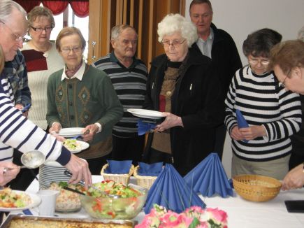 Tilaisuuden päätteeksi söimme kauniisti katetun maukkaan lounaan: herkullista kinkkukiusausta, vihanneksia, vihersalaattia ja italiansalaattia; jälkiruokaa. Kiitokset Timolle ja Kivirannan keittiöväelle.