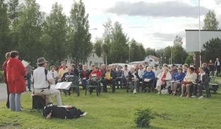 ![]() Toive toteutuiMaija Suuniitun "Kotikylän puiston" puuhanaisen pitkäaikainen toive toteutui 17.7. kello 19.00. 70 innokasta laulajaa ja kuuntelijaa suunnisti puistoon, lauluiltaan, jonka säestäjänä toimi Pekka Turpeinen, esilaulajina Vehkaperän "Pavarotti" Pentti Pekkarinen ja kirkonkylän laululintu Aira Toivanen. Laulujen lomassa saimme kuulla kesäiltaan sopivia runojakin Maijan, Annikin ja Juhanin. Tunnelma oli korkealla, kello oli lähellä yhdeksää ennenkuin maltettiin lopettaa. Varmaan monelle tuli mieleen ajatus, että näitä voisi olla useamminkin. Sääkin oli meille armollinen, sadekuurot menivät sopivasti ohi, vaikka uhkaavalta näyttikin. Kylätuvan naiset pitivät huolen, ettei kenenkään kurkku päässyt kuivumaan, eikä maha murisemaan, sillä letut olivat suussa sulavia ja kahvi hyvää. Remmissä tällä kertaa Sirkka Lautanen, Eila Halmesaari ja Liisa Olkkonen. |