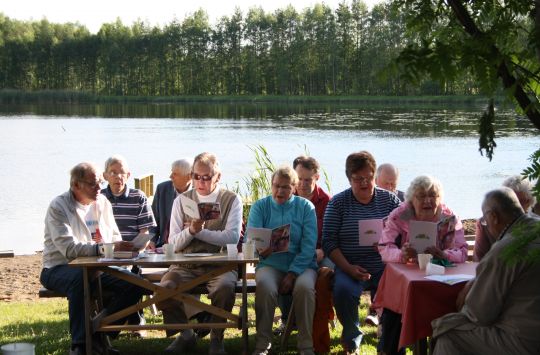 Aurinko paistoi, käki kukkui ja luonto oli rehevimmillään. Ei edes hyttyset kiusanneet, kun lauloimme monta tuttua kesälaulua kanttori Minna Erkkilän säestyksellä. Kirkkoherra puhui tämän viikon tekstin johdannolla ja Luojan töiden innoittamana. Elämme vuoden valoisinta aikaa. Kesäpäivän seisaus osuu tänä vuonna juuri juhannusaattoon. Karjalammelle oli kokoontunut väkeä runsaasti ja Kirkonkylän pohjoisen alueen emännät olivat laittaneet runsaan kahvipöydän. Antti Löytönen paistoi meille makkaroita ja kertoi paikasta sekä rakennuksista. Hän muisteli nuorukaisena kyntäneensä hevosella huvilan paikalla olleilla pelloilla. Nyt paikalla on hieno nurmikko ja hiekkaranta. 1970-luvun alussa paikalle siirrettiin saunarakennus. Myöhemmin pystytettiin huvilarakennus ja muut rakennukset.