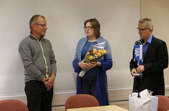 Kunnan puolesta läksiäislahjan ojensivat ja puheet pitivät kunnanvaltuuston puheenjohtaja Johanna Humalajoki ja kunnanjohtaja Eero Ylitalo. Ja kuten Eero totesi, pari vuotta on lyhyt aika mutta vielä lyhyemmmäksi jäi Jounin ja Eeron yhteistyö, joka kesti vain pari kuukautta. Työntekijöiden muistamisen ojensi Leila Järvinen halausten kera.