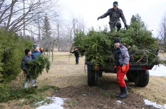 Eipä aikaakaan kun homma oli valmis ja päästiin kunnon "talkoomurkinalle". Ja tuntui (kuten pitääkin) siltä, että tärkeintä olikin immeisten yhdessäolo ja jutustelu. Mikäs siinä oli samalla heitellä kuusaidan oksia raktorin lavalle ja sen jälkeen jatkaa "turinoita" paistetun makkaran ja lämpösen kahvikupposen ääressä!