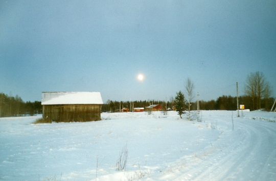 Kuva: Pohjosen riihi kuutamolla, taustalla Aarno Uusimäen tiilitalo.