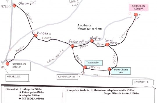 Ja kuten kartastakin näkyy: Reitille pääsee Kumpulan koululta (Metsolaan n. 8km) tai Alapihasta (Metsolaan n. 4 km).
