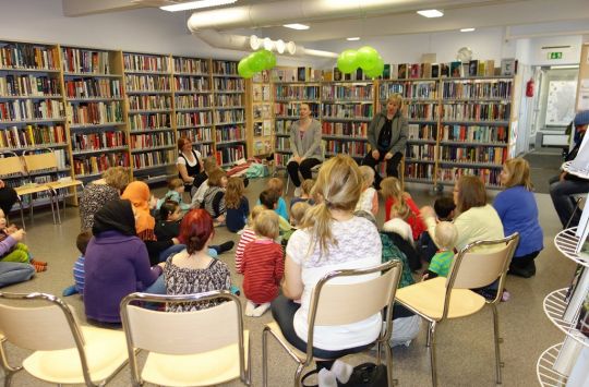 Tiistaina oli vuorossa satutunti. Kirjastolaiset järjestivät satuosuuden ja Päiväkoti Muksulan väki laulatti ja leikitti lapsia. Olipa kivaa leikkiä pitkästä aikaa! Ei olisi tahtonut yhteisen hetken loppuvan. Satutunnin päätteeksi lapset saivat POP-pankin lahjoittamia ilmapalloja. Hymyissä suin lähdettiin palloja puhaltelemaan.