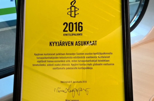 Palkinnon vastaanottivat kyyjärvisten puolesta Amnesty Internationalin toimistolla Helsingissä vapaaehtoistyöntekijoiden edustajana Kaisa Tamminen, turvapaikanhakijoiden edustajana Mahmood Hasanen sekä kuntaorganisaation puolesta kunnanjohtaja Eero Ylitalo.