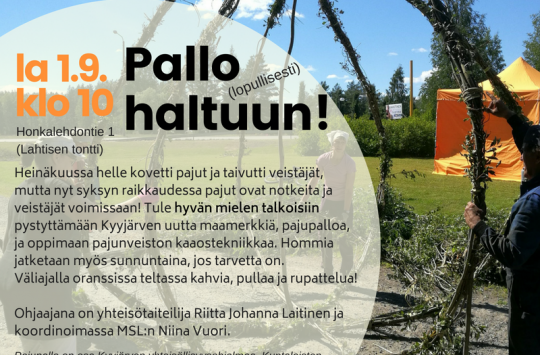 Pallo haltuun! Kyyjärvi-viikolla raivattiin pajuja ja aloitettiin suuren pajuveistoksen, Kyyjärveä symboloivan pallon, rakentamista. Helteinen sää teki kuitenkin tepposensa sekä pajuille että veistäjille. Nyt kun olemme kesän latautuneet lämmöllä, jatkamme pajunveistoa ja nostamme pallon pystyyn kiertoliittymän viereen, Kyyjärven uudeksi maamerkiksi. Koska kyseessä on korkea ja näyttävä teos, vahvoja nostajia tarvitaan paikalle runsain joukoin! Samalla opit pajunveiston tekniikkaa.