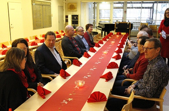 Ruokapalvelupäällikkö Timo Lahti henkilökuntineen oli jälleen kerran loihtinut maukkaan puurokattauksen. Tarjolla oli riisipuuron päälle sokeria, kanelia ja tietenkin myös luumusoppaa. Ja puurossa manteli. Torttukahvit päälle palan painikkeeksi. Yksikertaisuudessaan toimiva ja tilaisuuteen sopiva kattaus. Kiitokset Timolle.