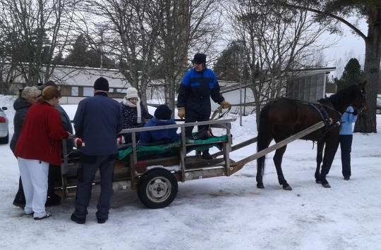 Kuvassa Karstulan Uusjokelan ja Mäntyrannan väkeä lähdössä hevosajelulle.