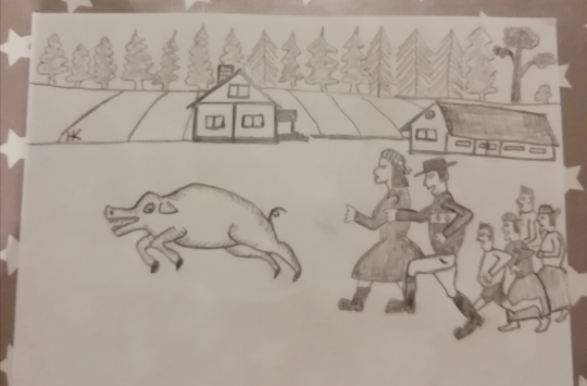 Sika seisoa nökötti tyytyväisen näköisenä apekuppi edessään karsinassaan. B asetti pienoiskiväärin piipun aidanraosta sian korvan taakse. Sialla on pienet aivot, B selosti. Sitä täytyy ampua täsmälleen oikeasta kulmasta, että luoti käy kohdalleen. Jos ampuu väärästä kulmasta, niin luoti vain raapaisee aivoja ja sika menettää malttinsa ja tulee hyvin vihaiseksi. A nyökytteli hyväksyvästi, sillä hän tiesi, että B:n puheessa oli vinha perä. Hän muisti kuinka hänen isänsä oli ampunut väärästä kulmasta sikaa. Luontokappale oli vinkuen painellut metsän pimentoihin ja sitä oli jouduttu jahtaamaan koko suurperheen voimin päivä ennen kuin se oli saatu kiinni.