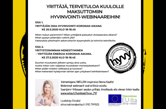 HYVY tarjoaa Saarijärvi-Viitasaari seudun yrittäjille maksuttomat hyvinvointiteemaiset webinaarit kahtena peräkkäisenä keskiviikkona.